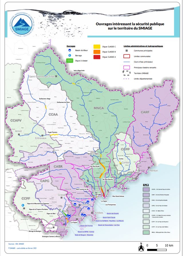 Les digues initialement gérées par le département des Alpes-Maritimes dans la Basse-vallée du Var sont également gérées par le SMIAGE.